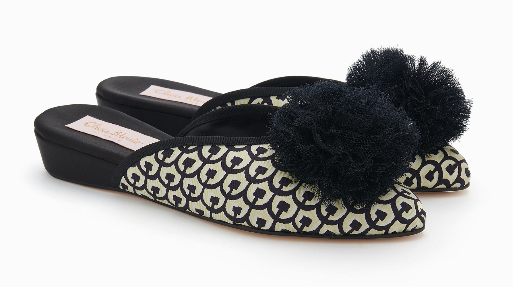 設計師喜歡以園藝、花卉、版畫和紡織品為設計靈感,並運用柔軟的天鵝絨和綢緞,輔以超大蝴蝶結或絨球等裝飾,為設計注入復古浪漫的情懷。品牌居家室內拖鞋的系列,以鮮豔絢麗的色彩為主軸,每件作品靈感皆源自於設計師在St Leonards on Sea聖倫納茲海濱度假小屋內最愛的物品及顏色,並以設計師Morris喜歡的花朵命名,包括Daphne、Poppy、Rose、Blossom,採用當地的皮革與材料,搭配設計師個人收藏的古董面料,以限量生產的方式於西班牙當地手工製造,精緻的面料搭配細膩的工藝細節,更為居家生活的每個時刻帶來不一樣的想像。