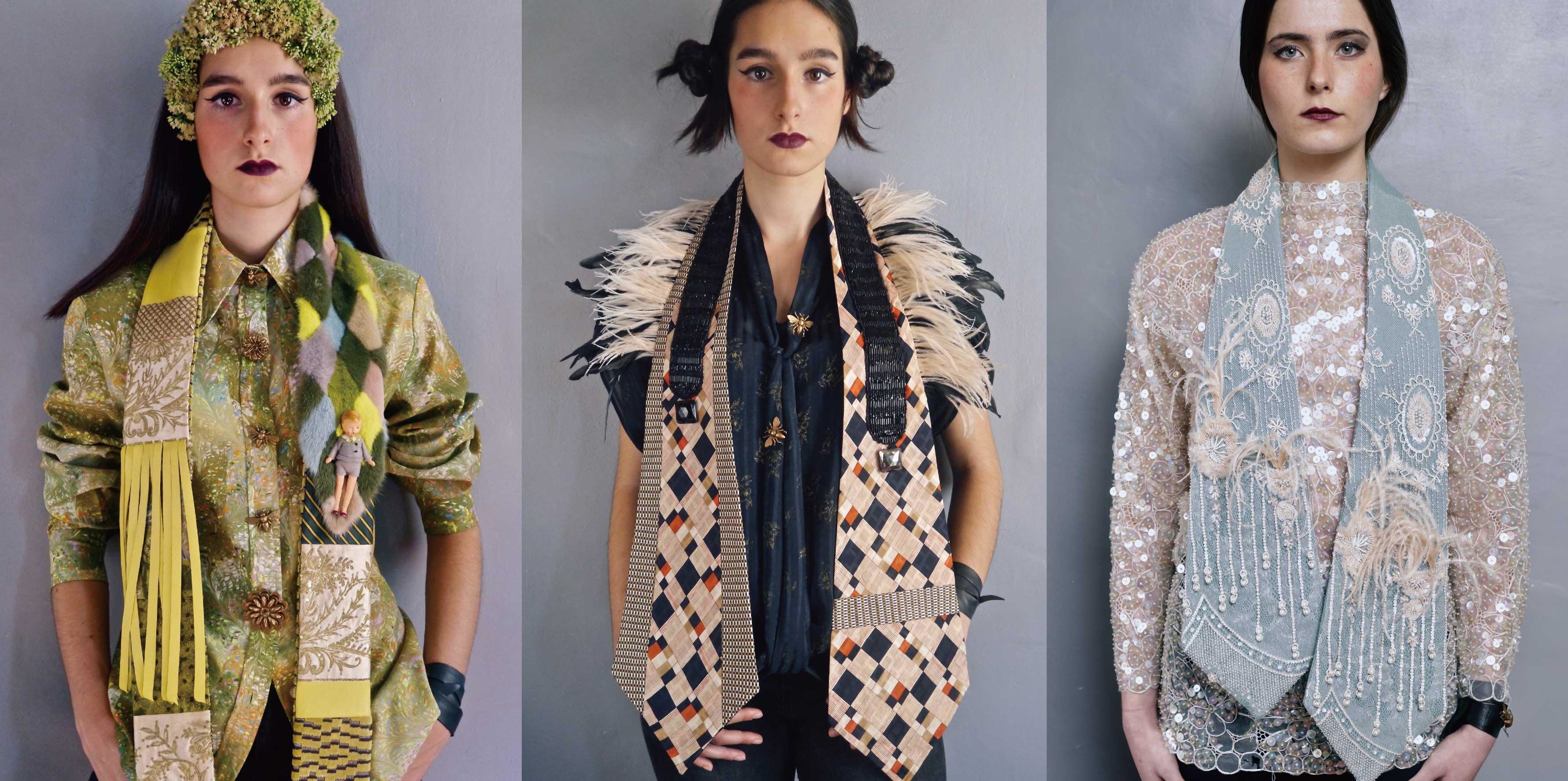 喜愛在旅行中蒐集靈感的Joëlle,在幾次的旅途中,遇見了許多美麗的古董布料、華麗寶石,或是精緻的刺繡、羽毛等裝飾元素,他將一路上所蒐集到的收藏與17世紀到1960年代的董古面料相互融合,並大膽地以男士領帶的輪廓作為創作的形式,轉化出獨一無二的絕美作品,每件作品都像在敘說一個屬於自己故事,引人細細品味。