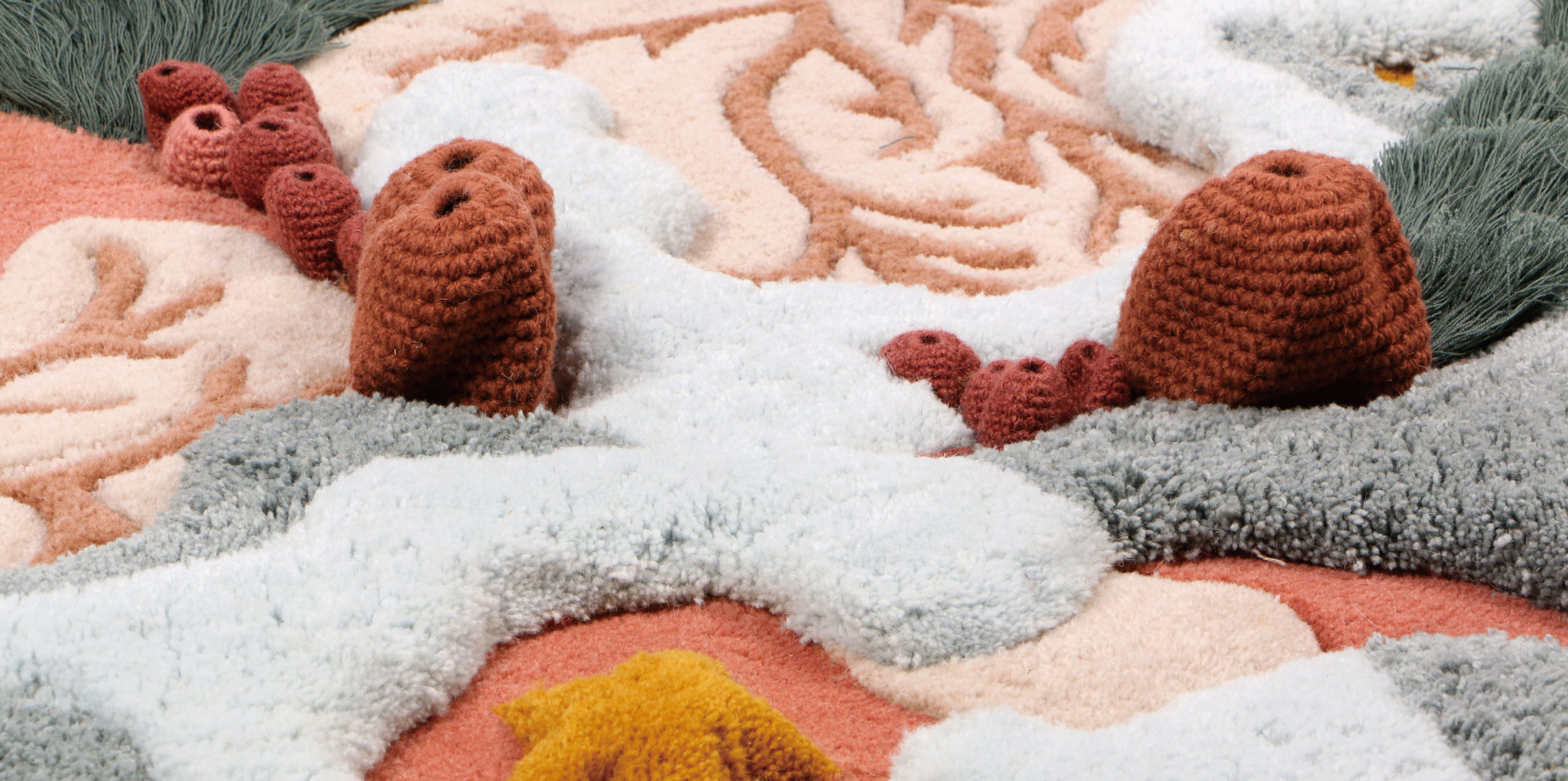 藝術家Vanessa Barragão從小在海邊長大,與海洋的連結成為她源源不絕的創作靈感來源,然而不斷升高的海水溫度、工業污染等,正一步步的威脅著她最熱愛的海洋,也因此,她希望能透過作品喚醒大家對海洋生態的重視。Vanessa擅長運用再生原料及環保素材詮釋出獨一無二的華麗掛毯,工廠廢棄的紗線,經過她的巧手可以幻化成美麗的海底世界。她以地毯繡、手簇、鉤針編織、流蘇花邊等傳統手工藝技法,表現出海底各種型態,富有層次及立體感的表現手法,繽紛的用色,將海底的樣貌詮釋得栩栩如生。其大膽而極具藝術性的創作受到各方青睞,多次受邀為展覽、室內空間領域打造織物裝置作品。