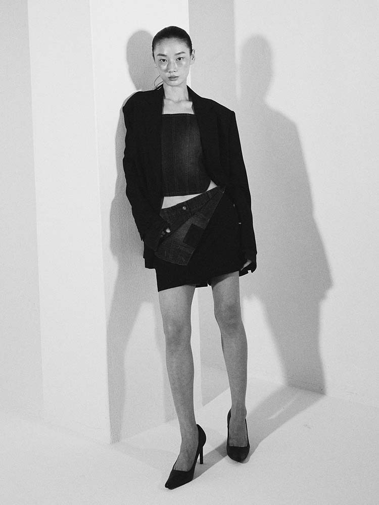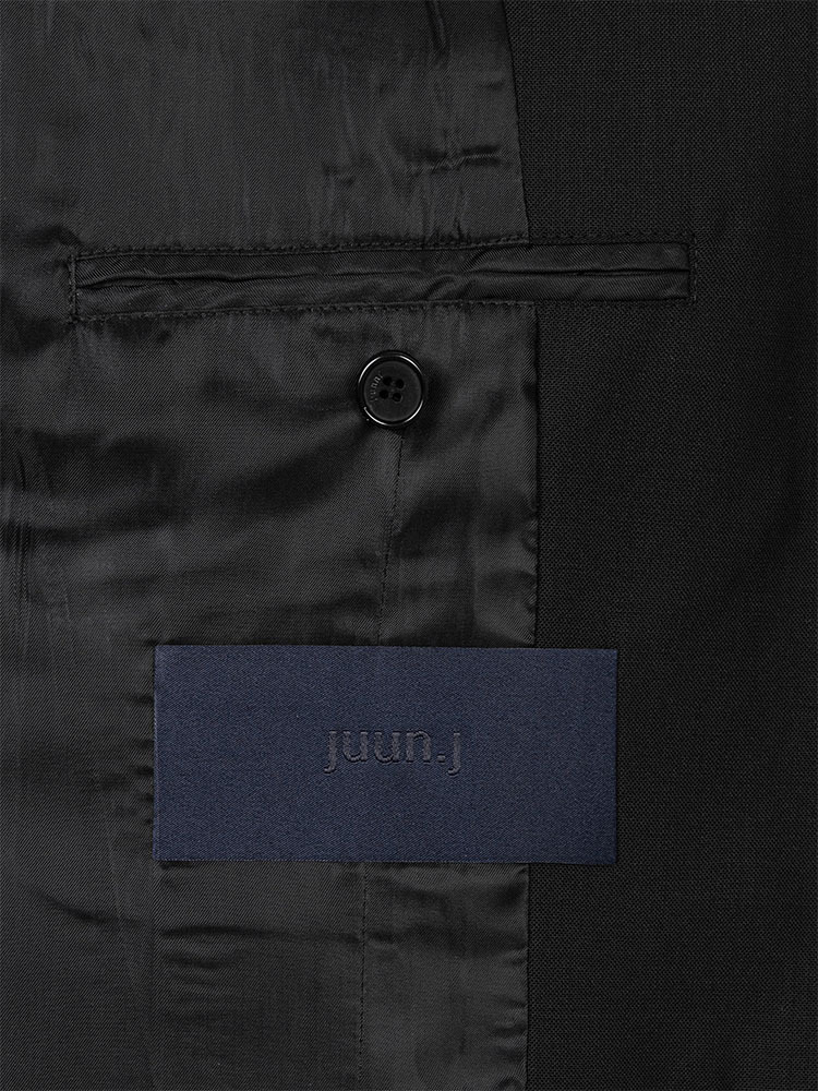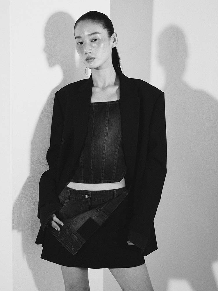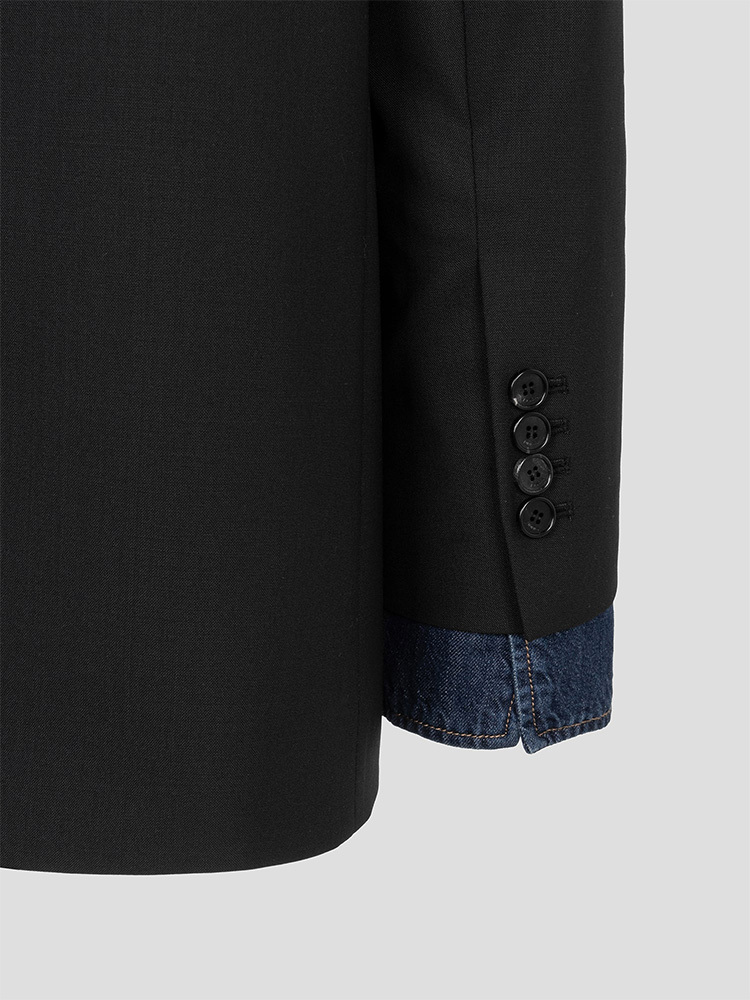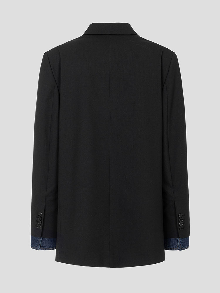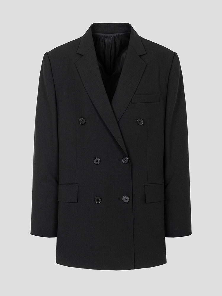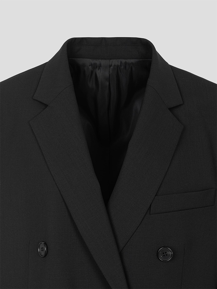 - 寬肩設計搭配雙排扣細節的黑色西裝外套