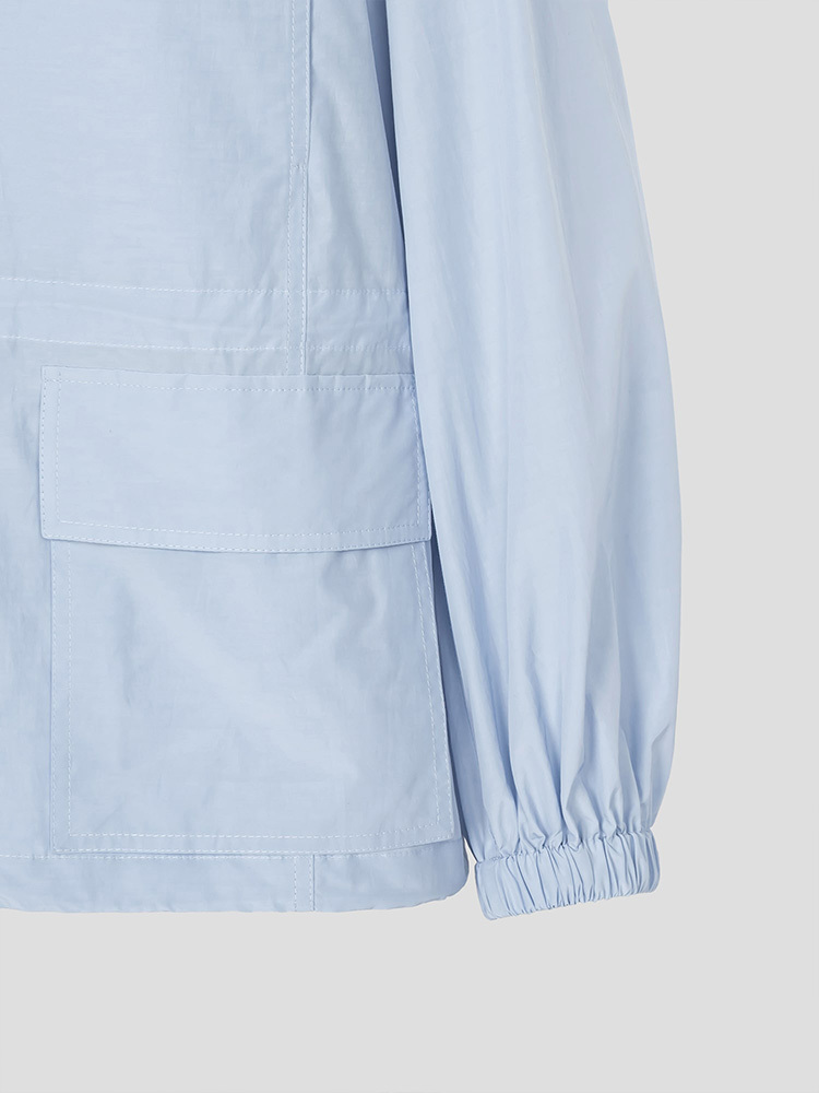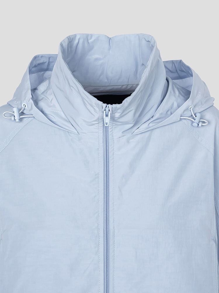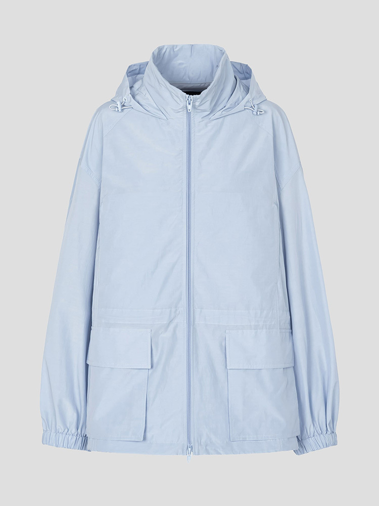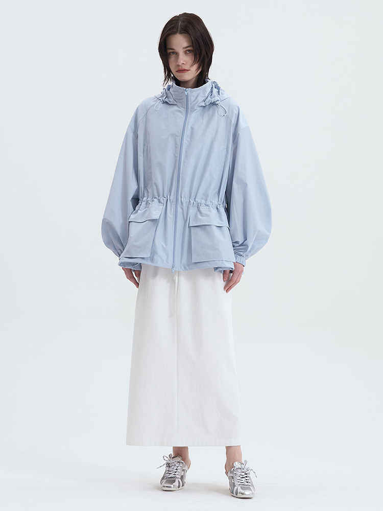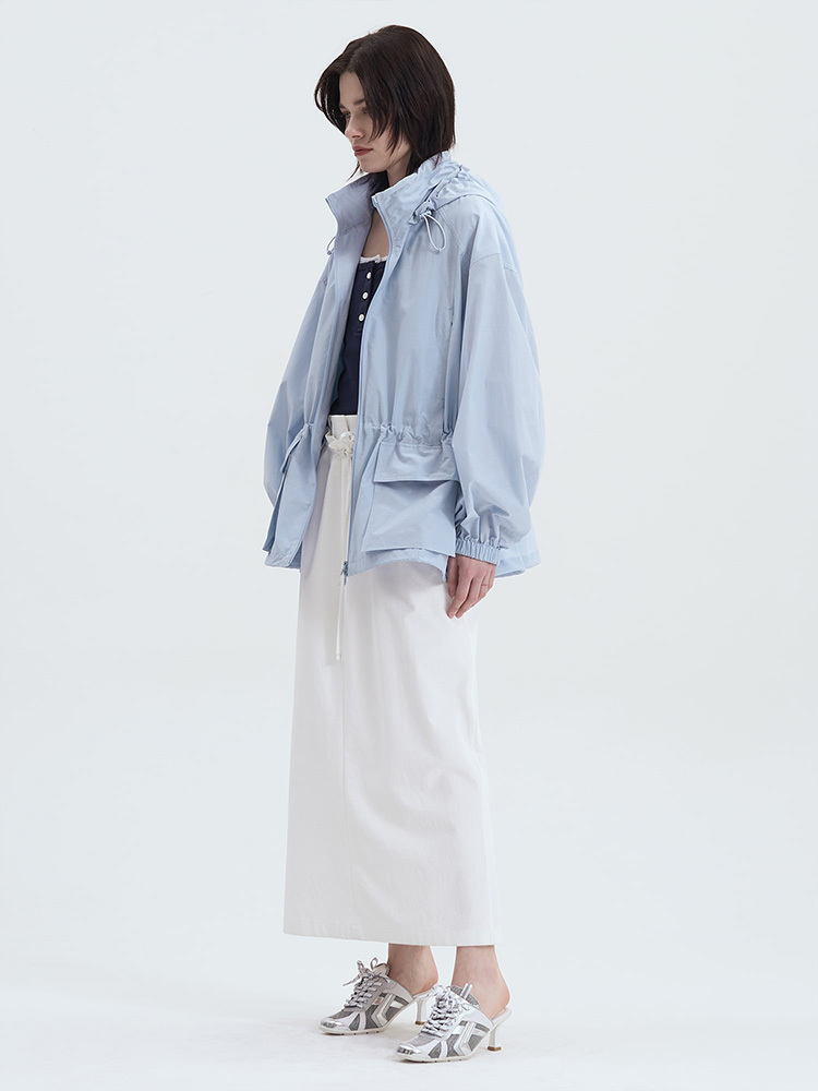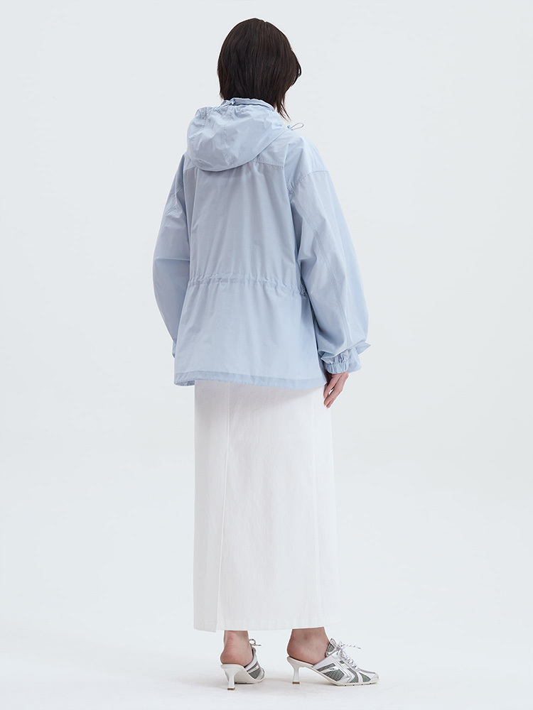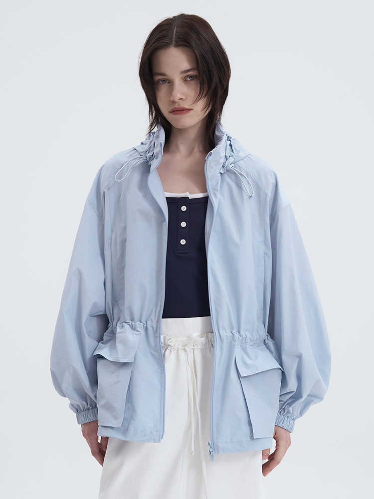 - 附腰部抽繩與可收納連帽細節