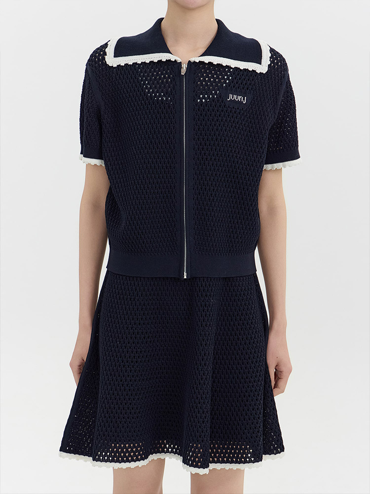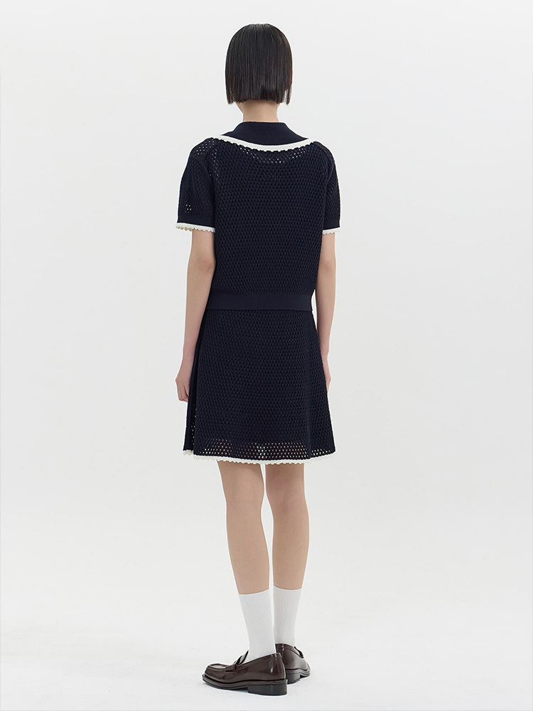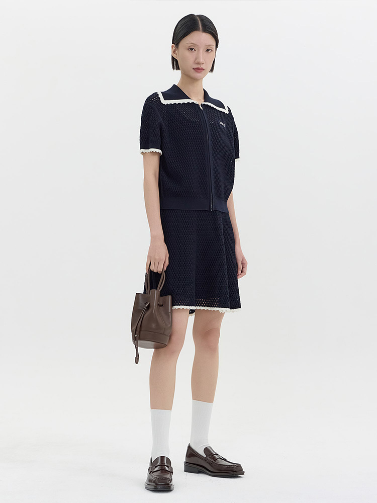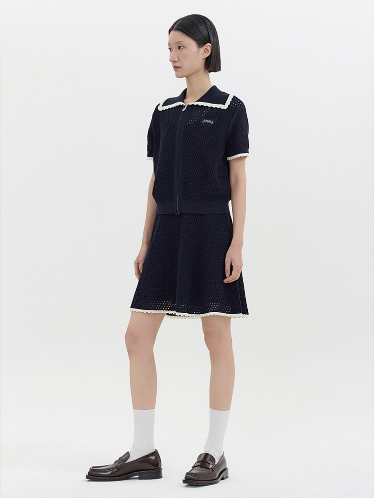- 海軍藍搭配白色波浪滾邊,點綴於下擺、領口與袖口
