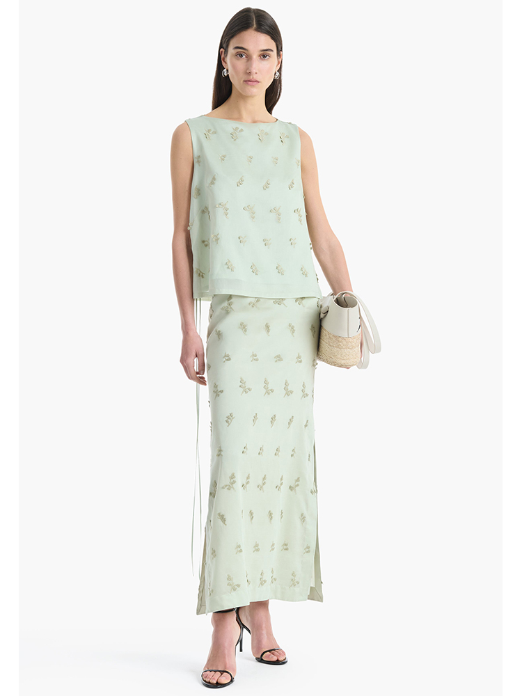 - 同色系的刺繡花卉圖案為設計增添了質感
