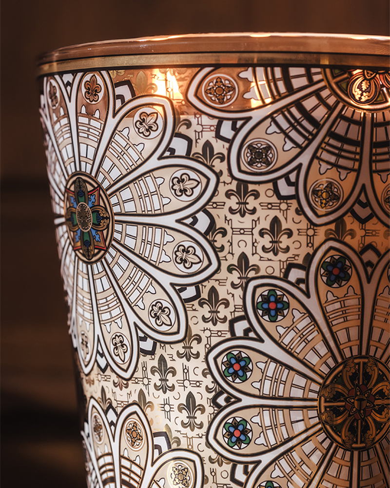 其玻璃杯身飾以精美的網版印刷圖案,金色與柔和的色彩勾勒出靈感源自中世紀玫瑰窗的紋樣。