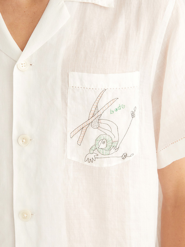 這件襯衫的靈感來自於二十世紀中期的一條圍巾,上面印有翻滾的滑雪者的圖案。我們用精緻的單線刺繡重現了這些圖案。這件襯衫由輕質亞麻製成,下擺帶有小花邊裝飾。