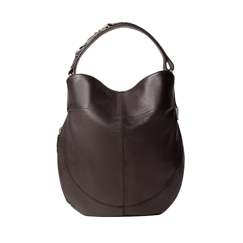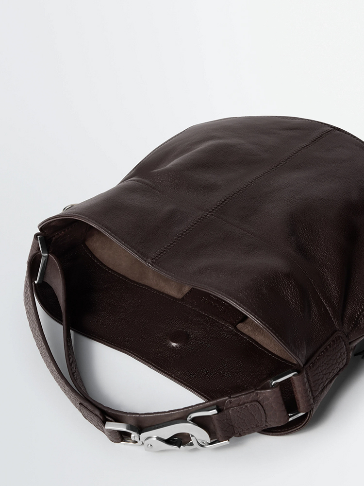 附有可調式皮革肩帶,飾以扣環和登山扣