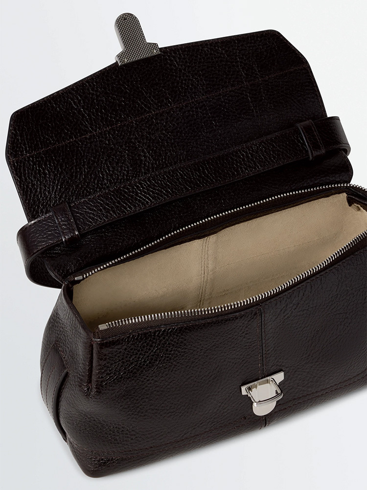 - 拉鍊開合,配金屬拉頭與皮革拉片