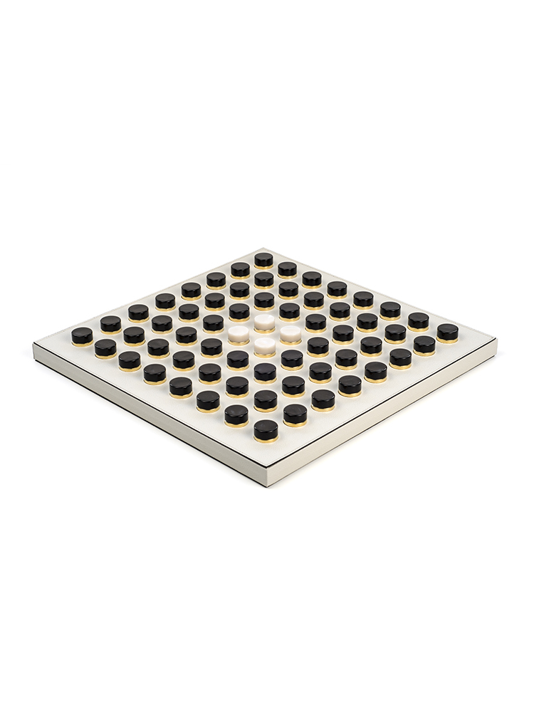 這套遊戲組配有 64 顆以珍貴環保貝殼製成並搭配亮澤金色飾面的棋子,棋盤結構採用木質材質,並覆以柔軟的小牛皮。