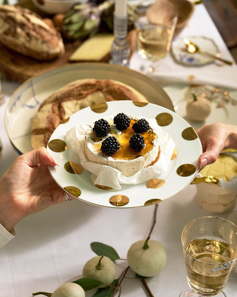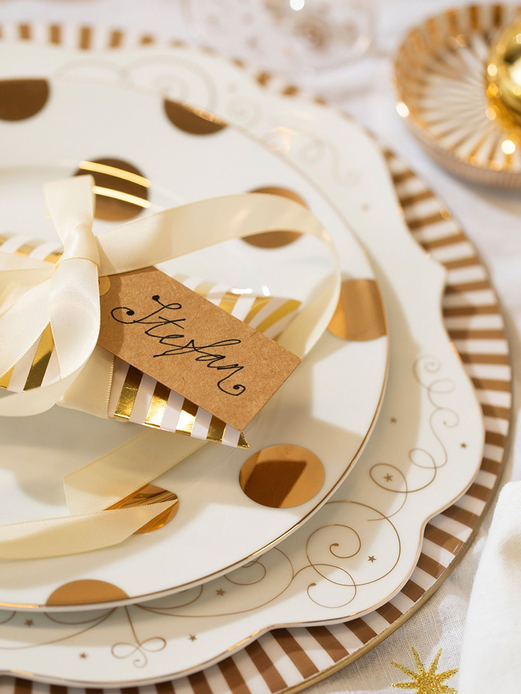Dot Delight系列餐盤,閃亮的金色圓點與條紋的結合,不僅吸睛還帶有一絲可愛俏皮。適合與Dot Delight同系列餐瓷搭配使用。