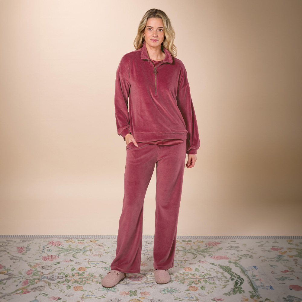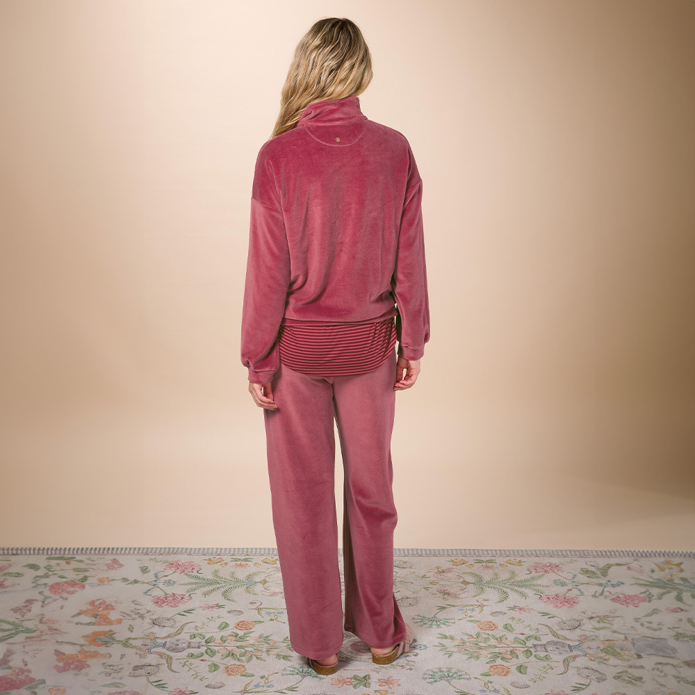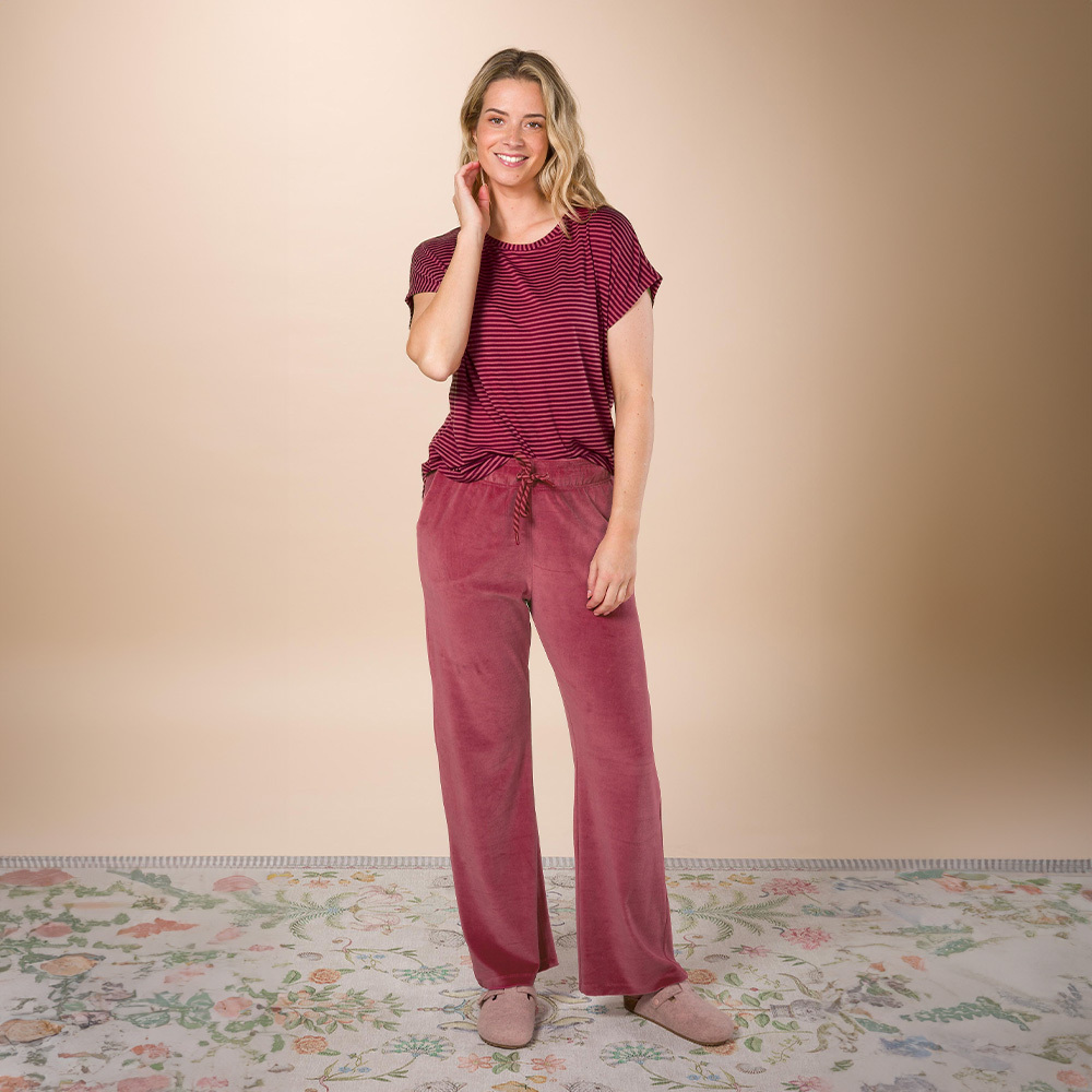 Britta 天鵝絨純色深粉紅色長褲將舒適與時尚完美結合。這款褲子採用奢華天鵝絨、80% 棉和 20% 聚酯纖維製成,彈性極佳,穿著舒適。鬆緊腰帶和條紋平紋針織抽繩確保完美貼合,直筒褲管和微喇剪裁打造優雅外觀。純色深粉紅色設計使這款褲子成為美麗的基本款,您可以輕鬆混搭。