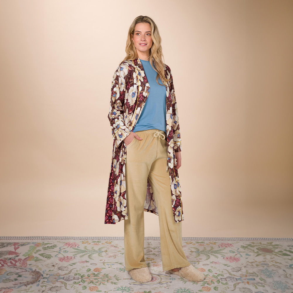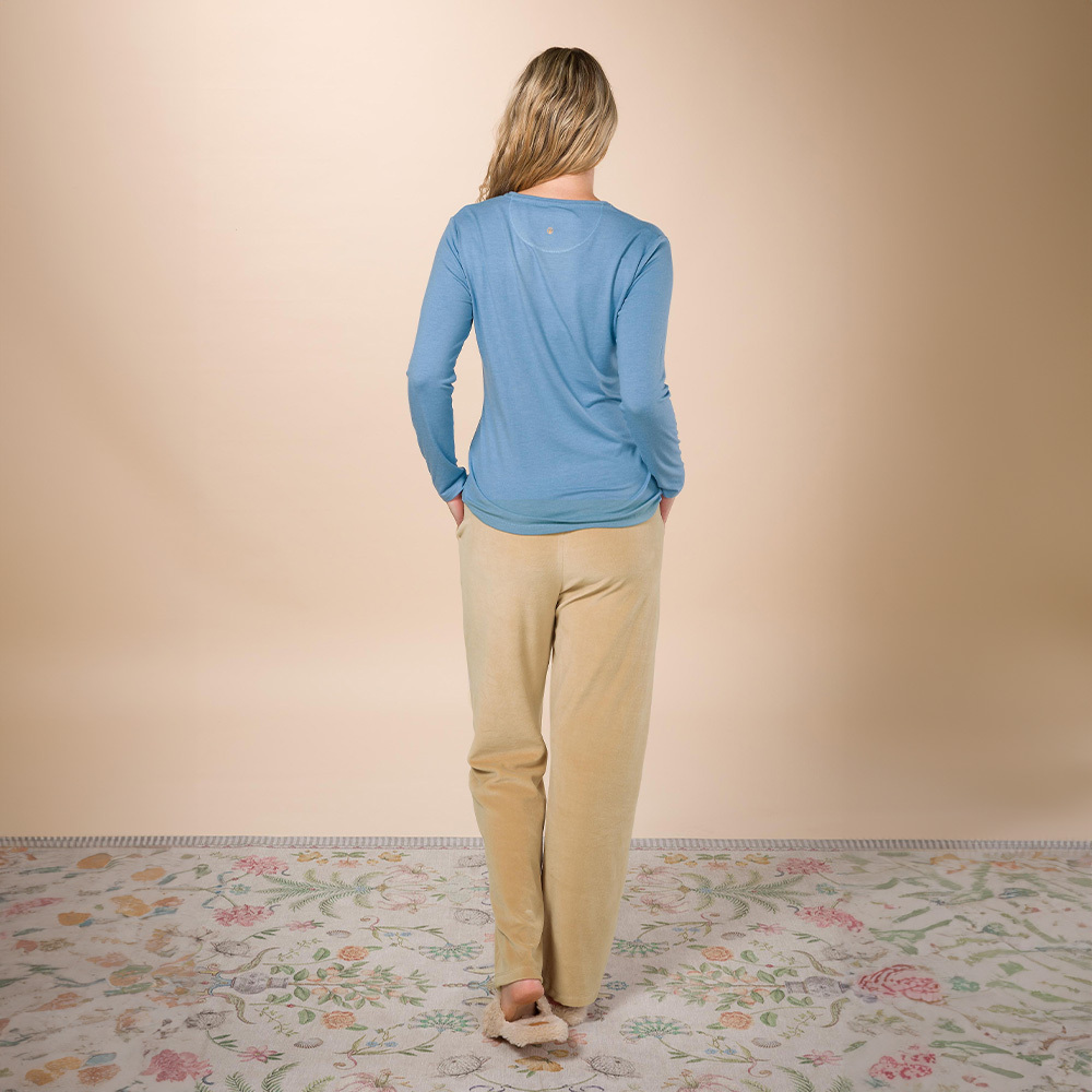 天鵝絨休閒褲,採用細緻奢華天鵝絨製成,親膚柔軟與彈性兼具,綁繩彈性褲頭與直筒微喇叭剪裁,舒適與優雅外觀兼具。