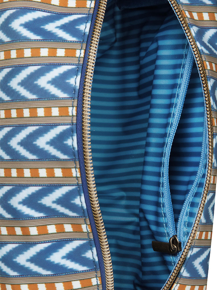 Samba條紋化妝收納包,採用森巴設計進行裝飾:彩色鋸齒形條紋,內裡大空間與收納層設計,可居家收納或旅行外出使用。