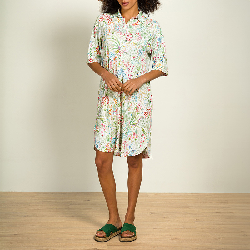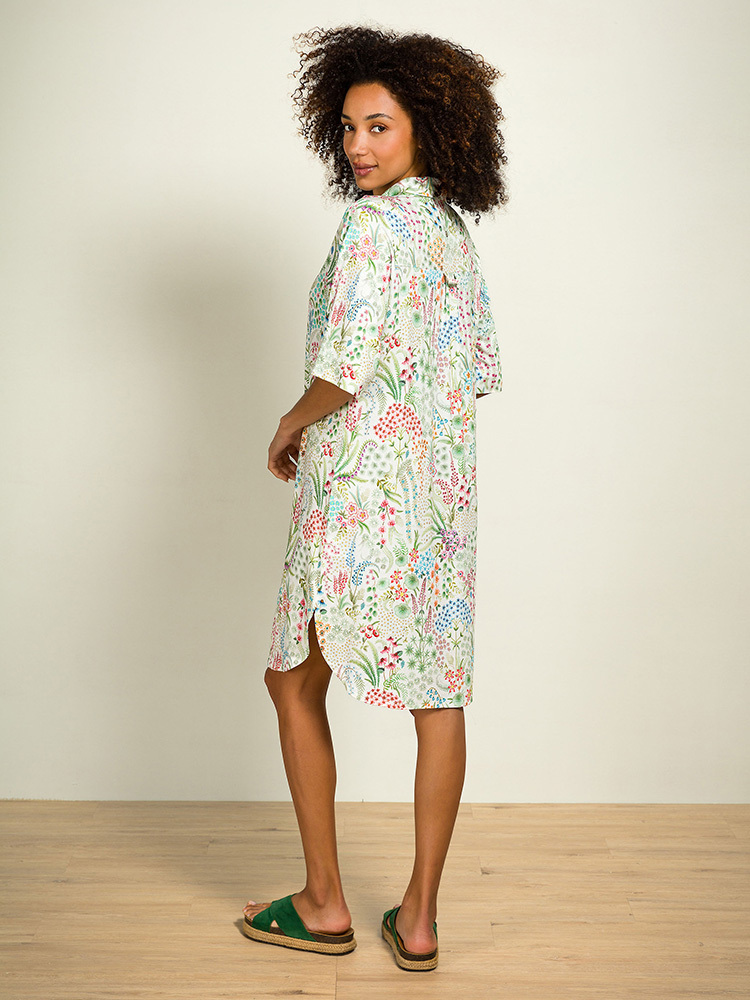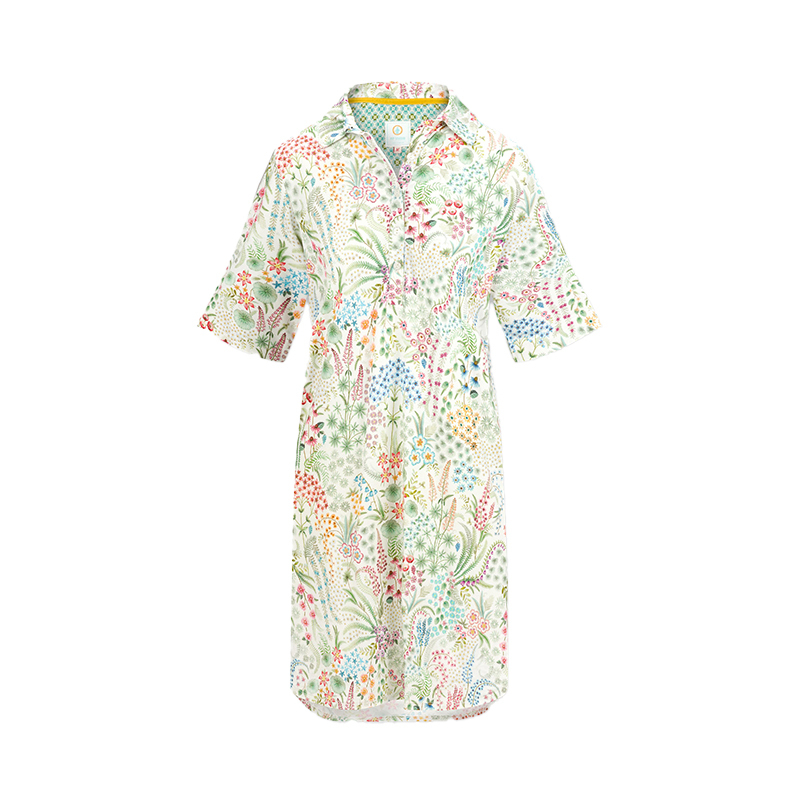 短袖連身睡裙,採用精緻花葉設計的Querida印花圖樣,襯衫領搭配質感細緻面料,打造居家穿著的極致舒適感。