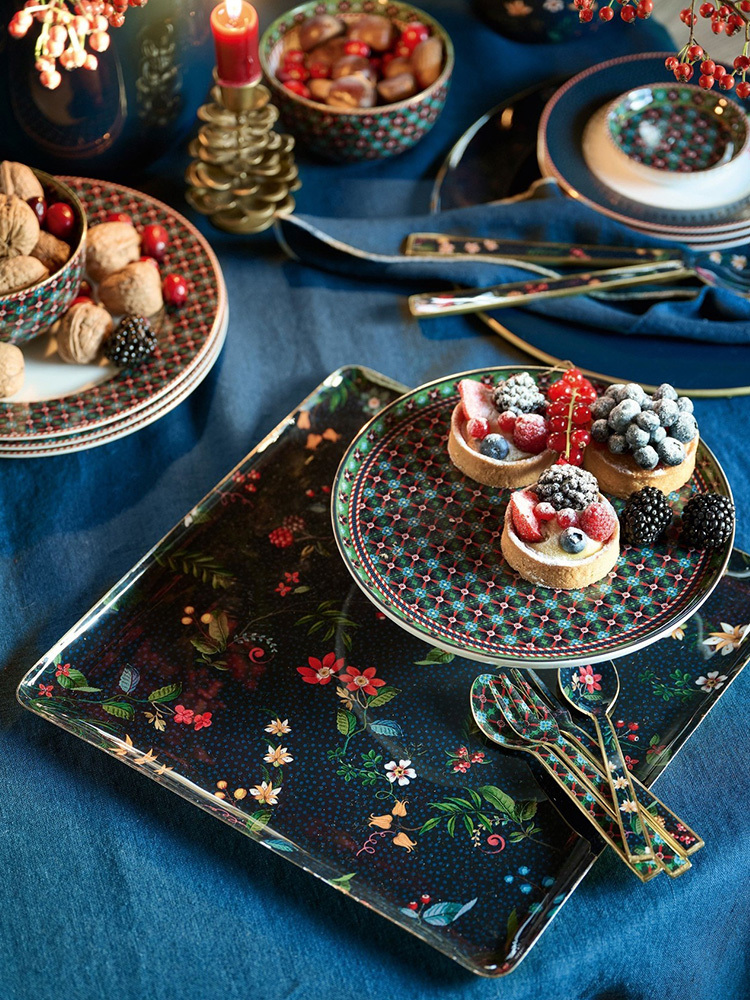 Berry Blues系列金屬托盤,托盤上裝飾著深藍色的花卉與漿果圖案,